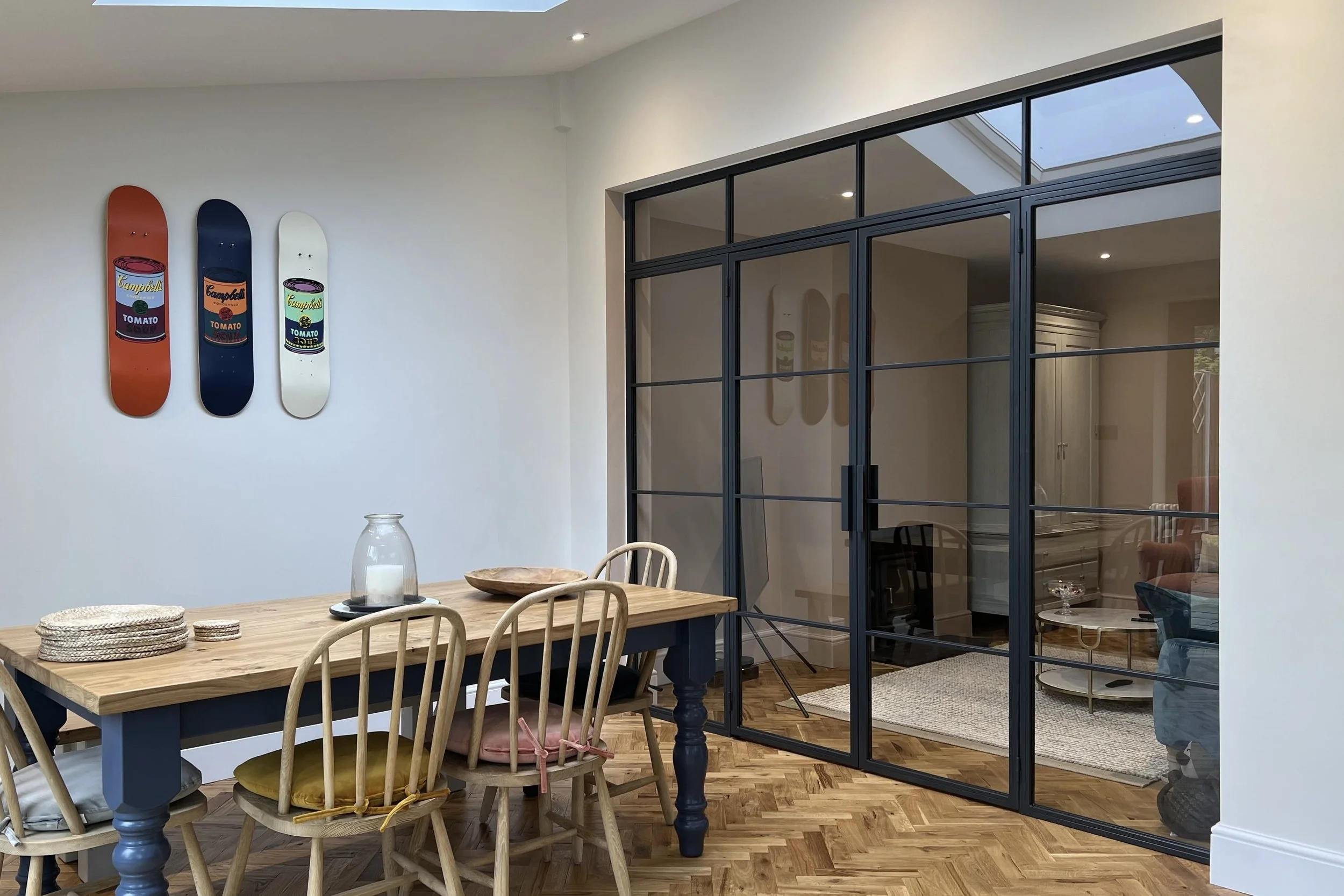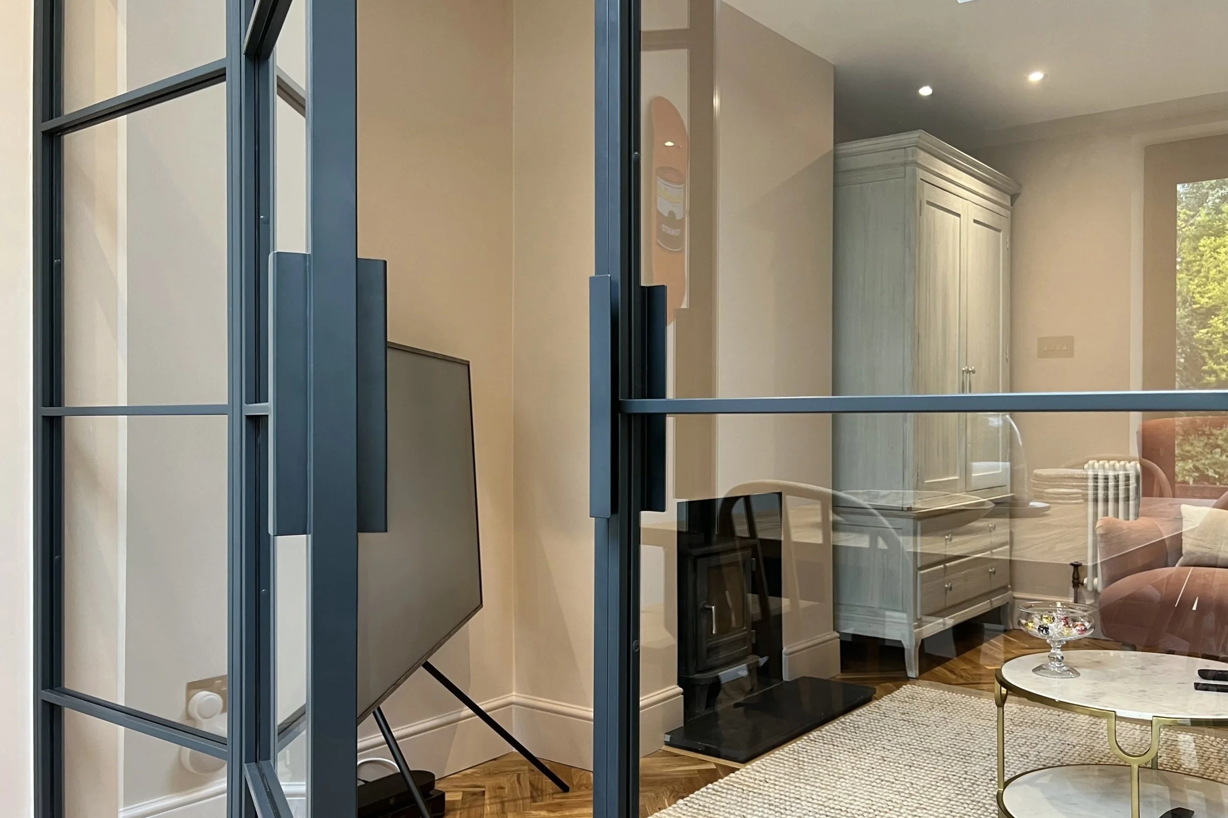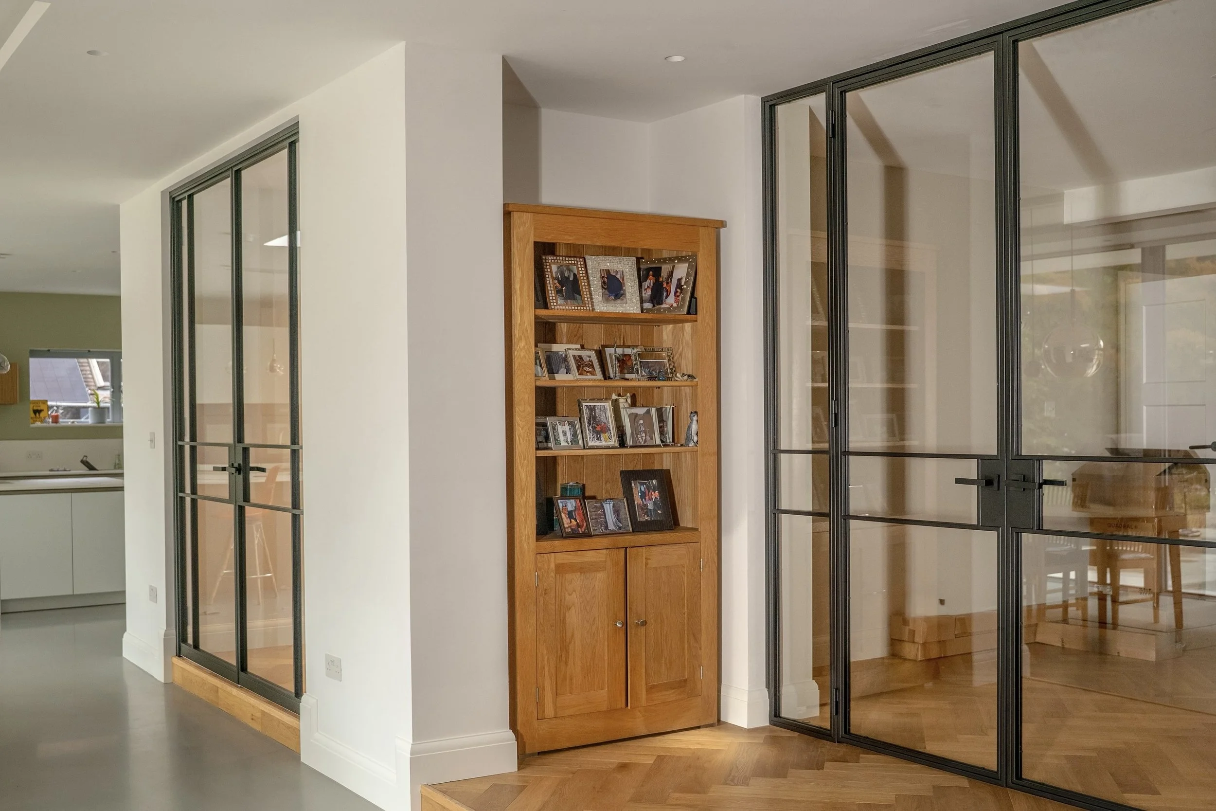 Alt text: Full-height steel framed internal door set adding drama and carrying light deeper into the space.