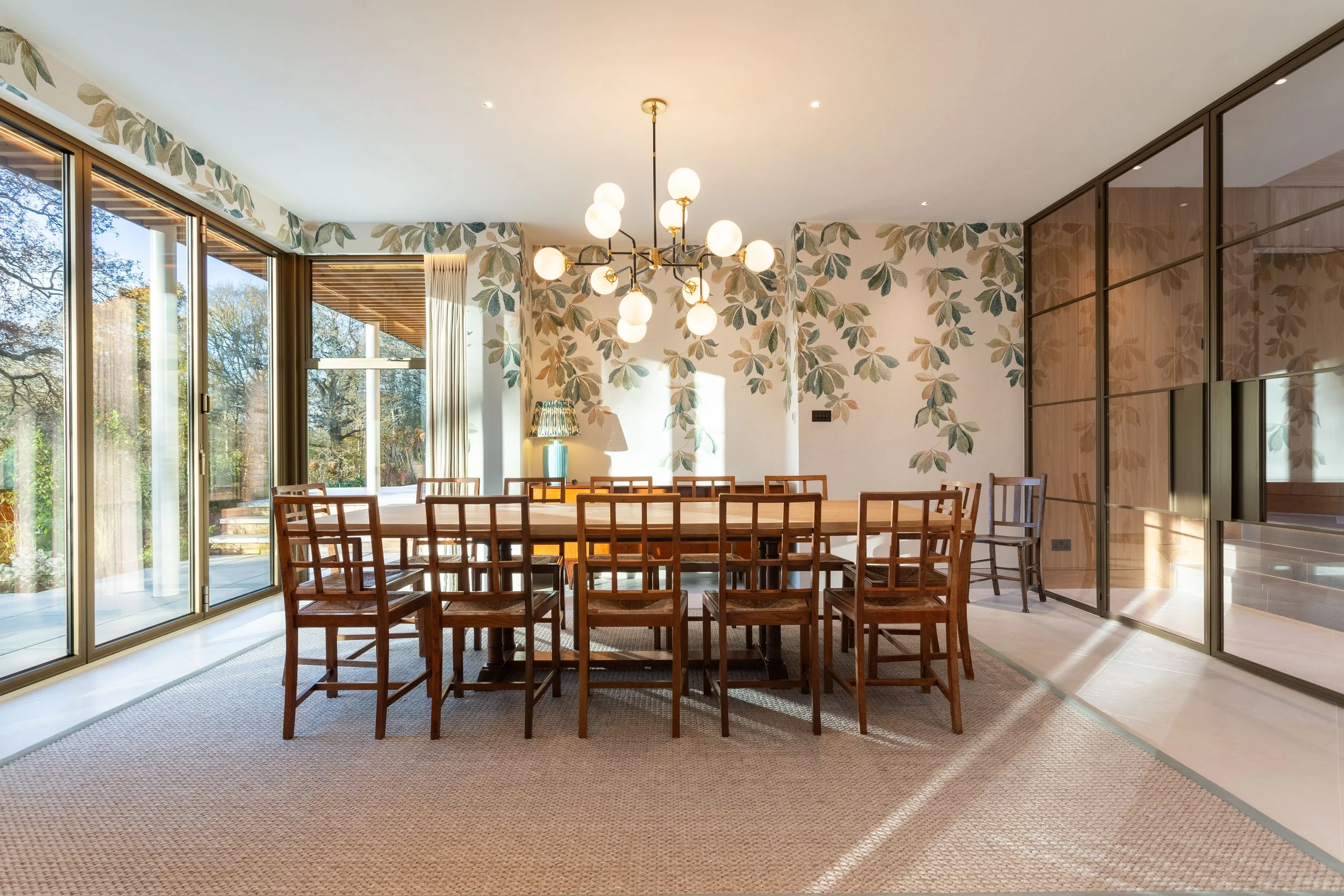 Alt text: Steel door glazing bars aligned with kitchen joinery and pendant lighting for cohesive design.