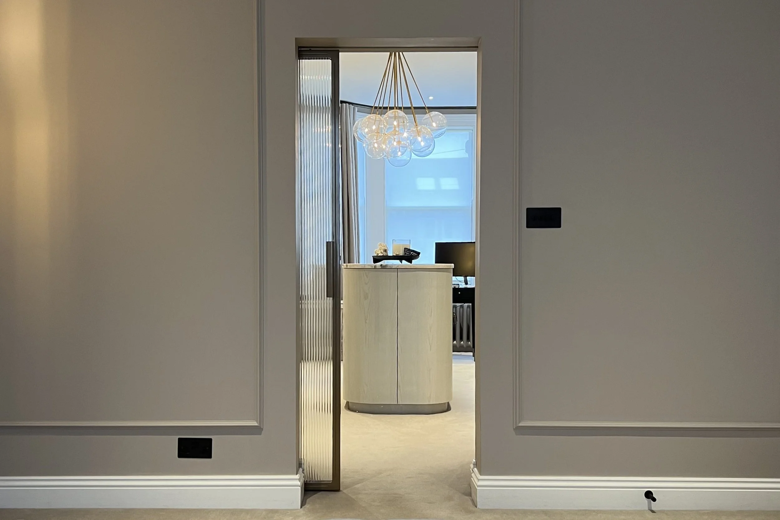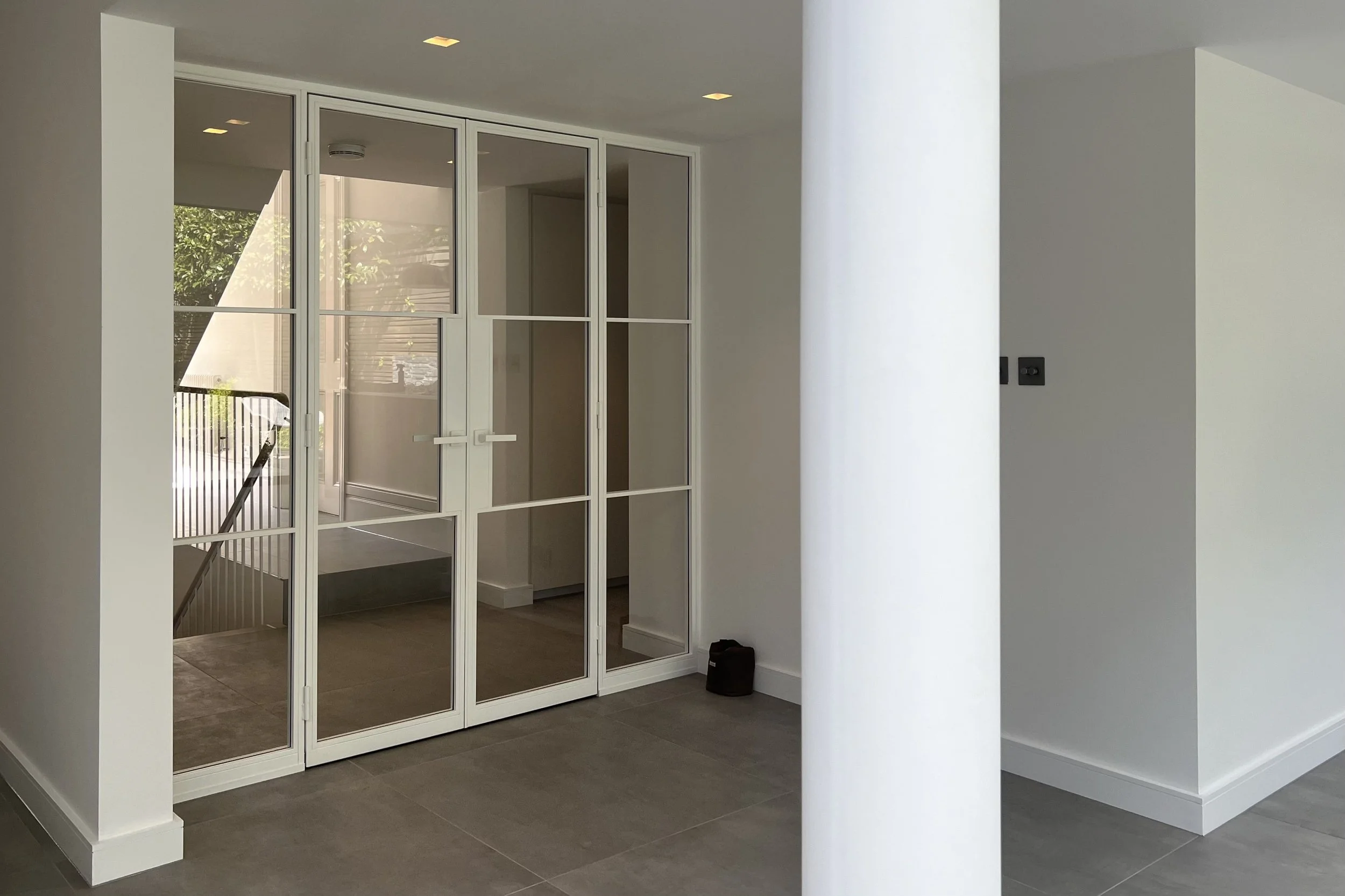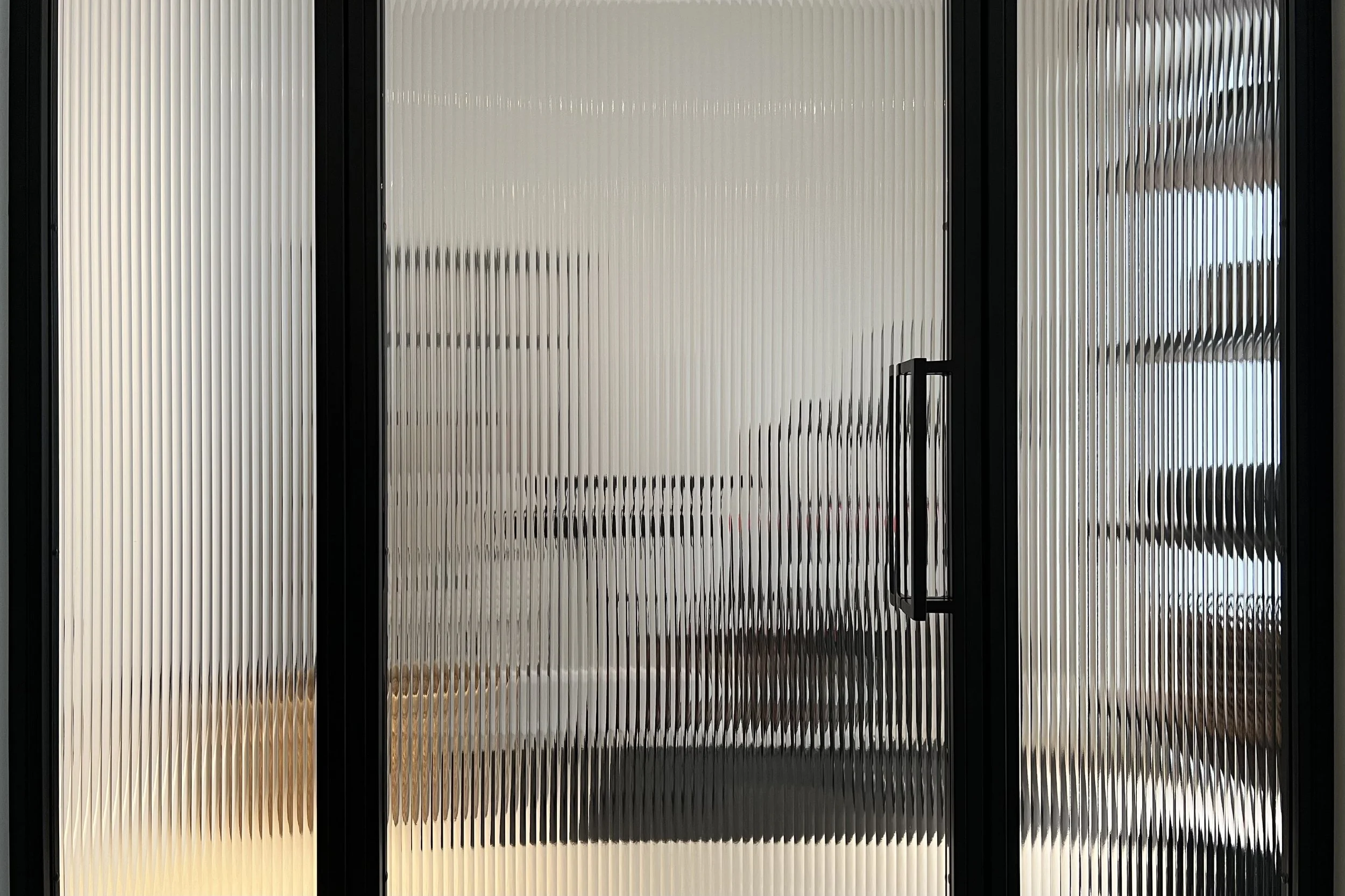 Case Study: In a Clapham home, a single hinged steel door with reeded glass was used to create a private gym studio off the livingspace. The slim steel profiles maintained openness and light while adding privacy — something that a chunky timber frame would have disrupted.