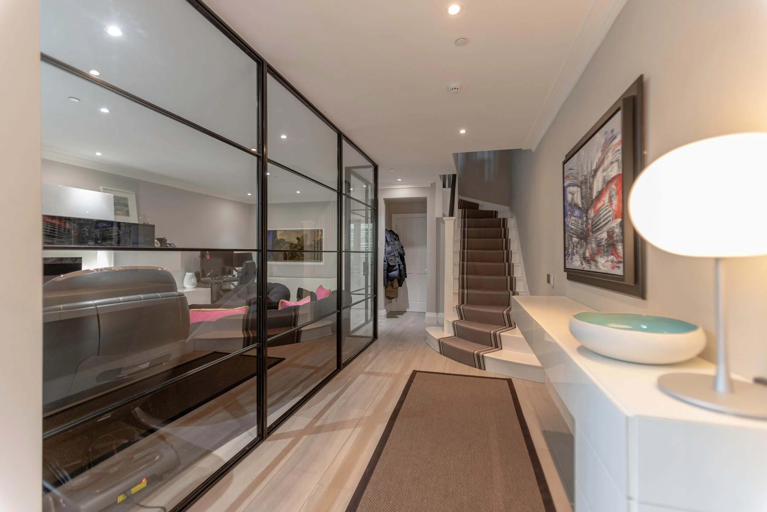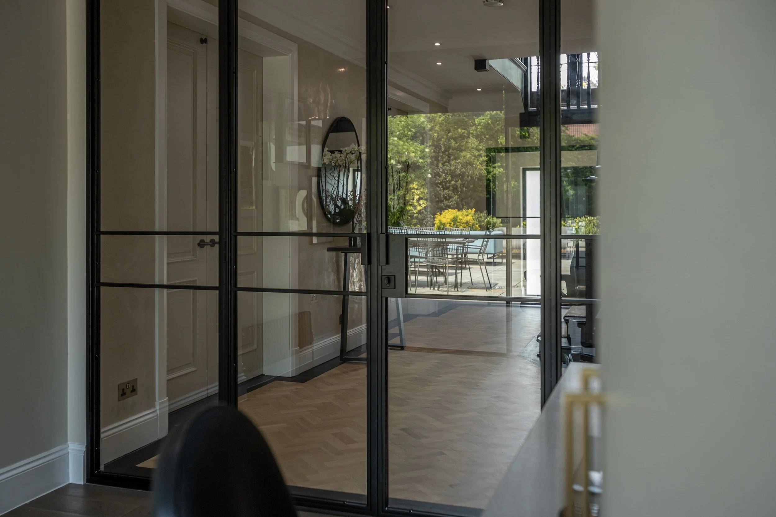 At the rear of the ground-floor hallway in Mill Hill, we formed a dedicated office using a double door set flanked by fixed side screens. The use of clear glass pulls daylight from the workspace into the hall, keeping the circulation bright while maintaining sightlines. Doors open, it reads as part of the ground-floor flow; doors closed, it becomes a calm, private zone for calls and concentrated work — still visually connected to the rest of the home.