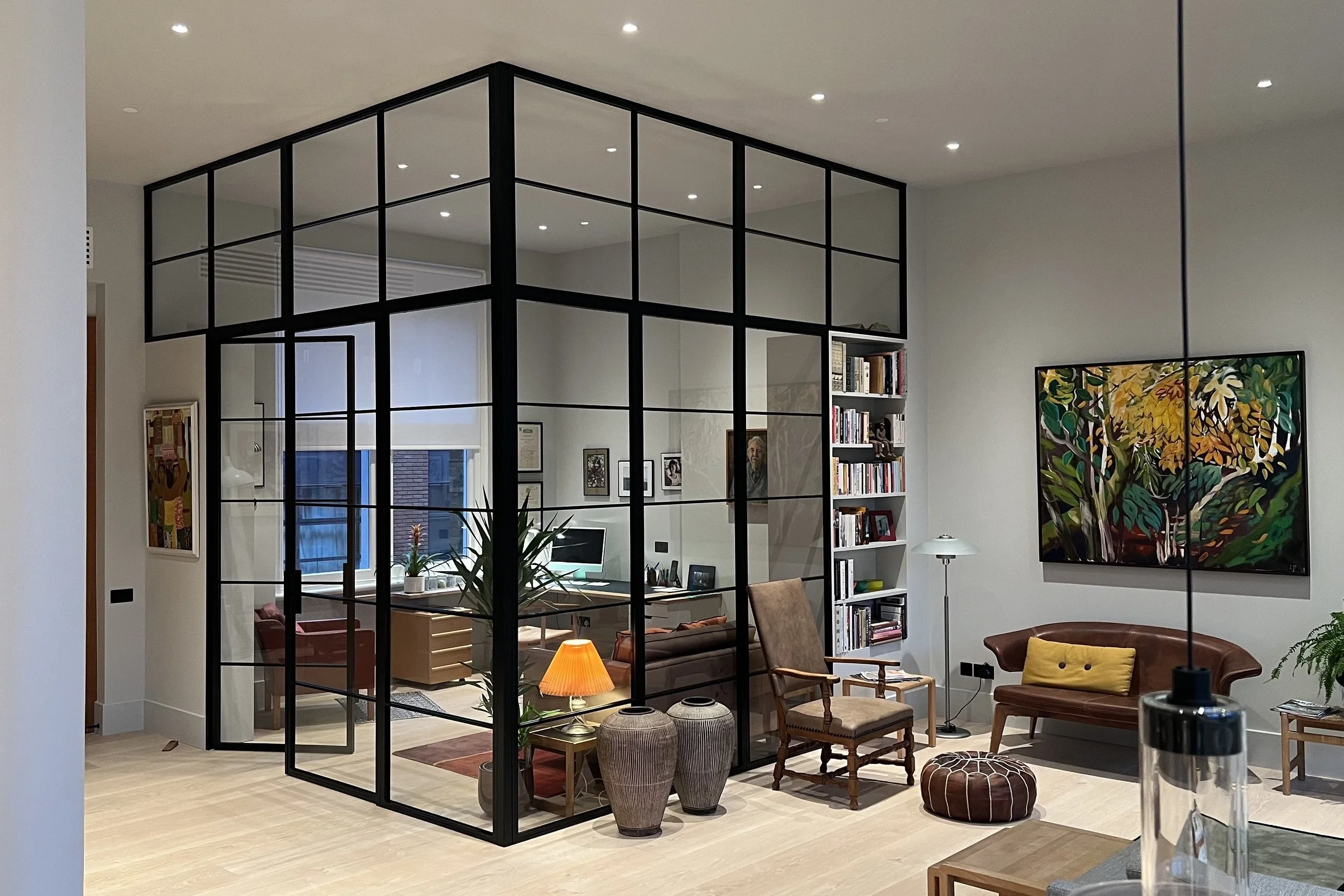 A camera-ready backdrop. In this London project, a double door set, integrated within two fixed screens at a 90° junction to create a corner library zone. The steel corner screen spans over 3600 mm tall and over 7200mm in combined width, keeping the space bright while the built-in shelving provides a composed, professional background for video calls. When the doors are closed, the room reads calm and refined without sacrificing openness.