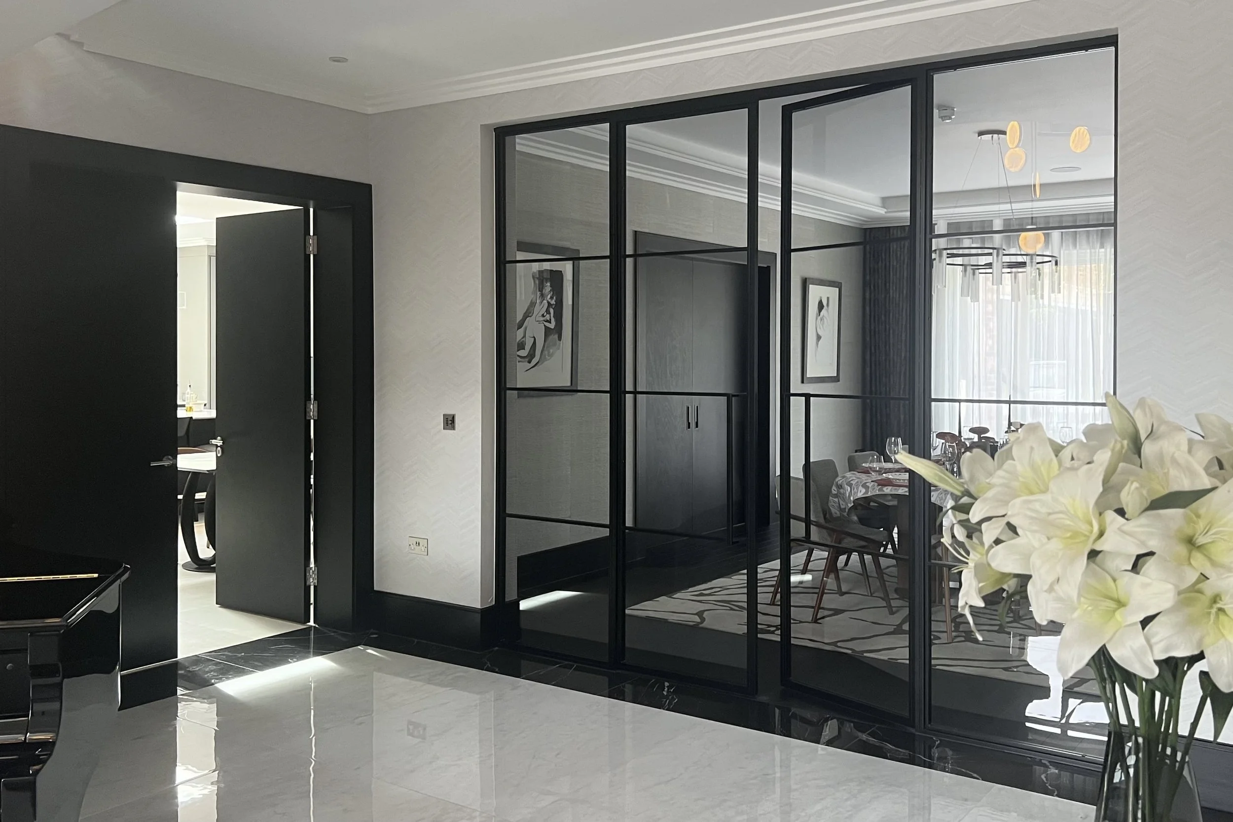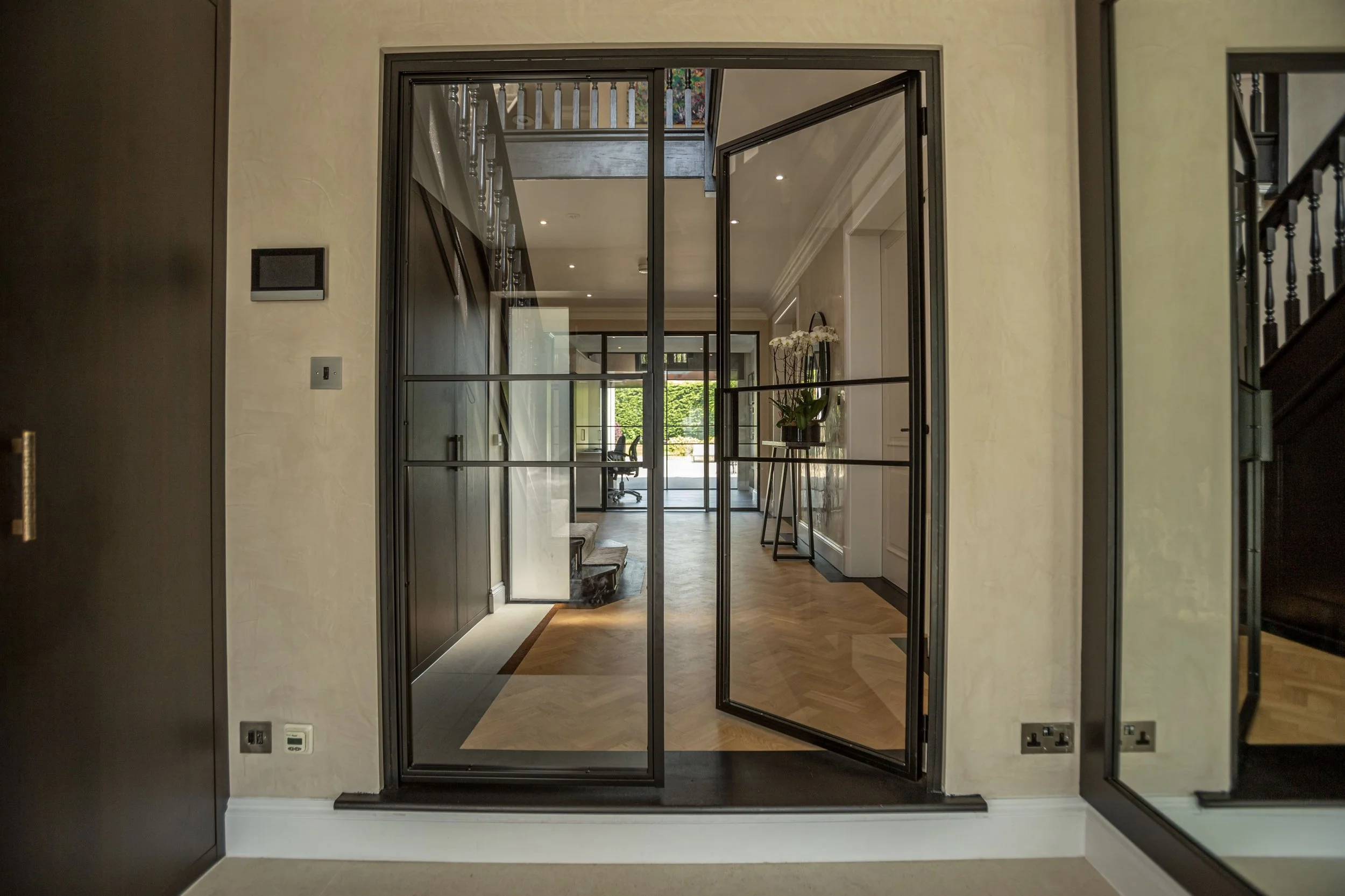 Steel framed doors can also be specified in unique formats — from oversized pivot doors to full-height fixed screens — without compromising the minimalist visual language required in high-end interiors.
