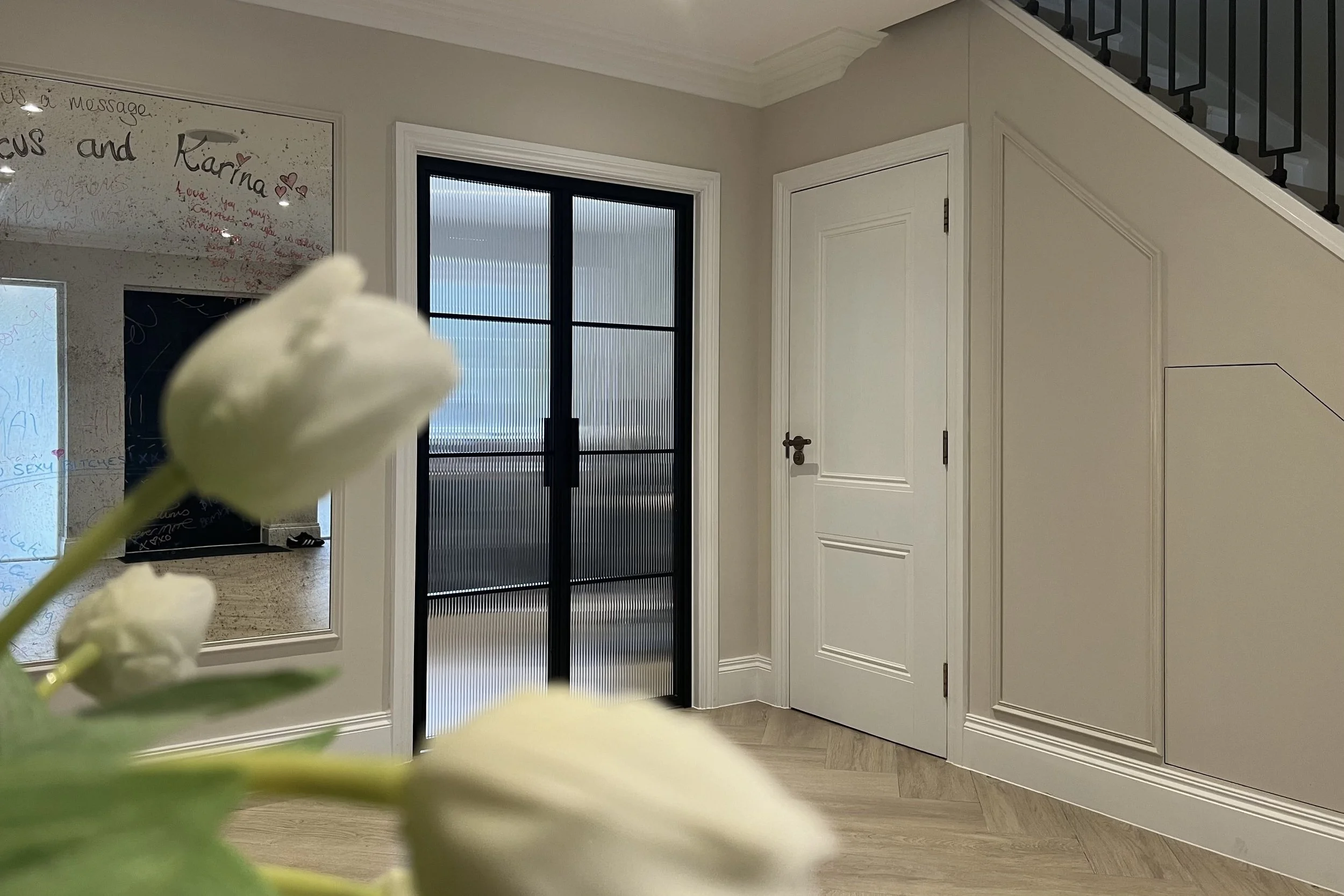 In a hybrid working home, we created a reeded-glass room divider for a private office. The glass allowed daylight to filter through, ensuring the workspace felt bright and energising while maintaining acoustic separation.
