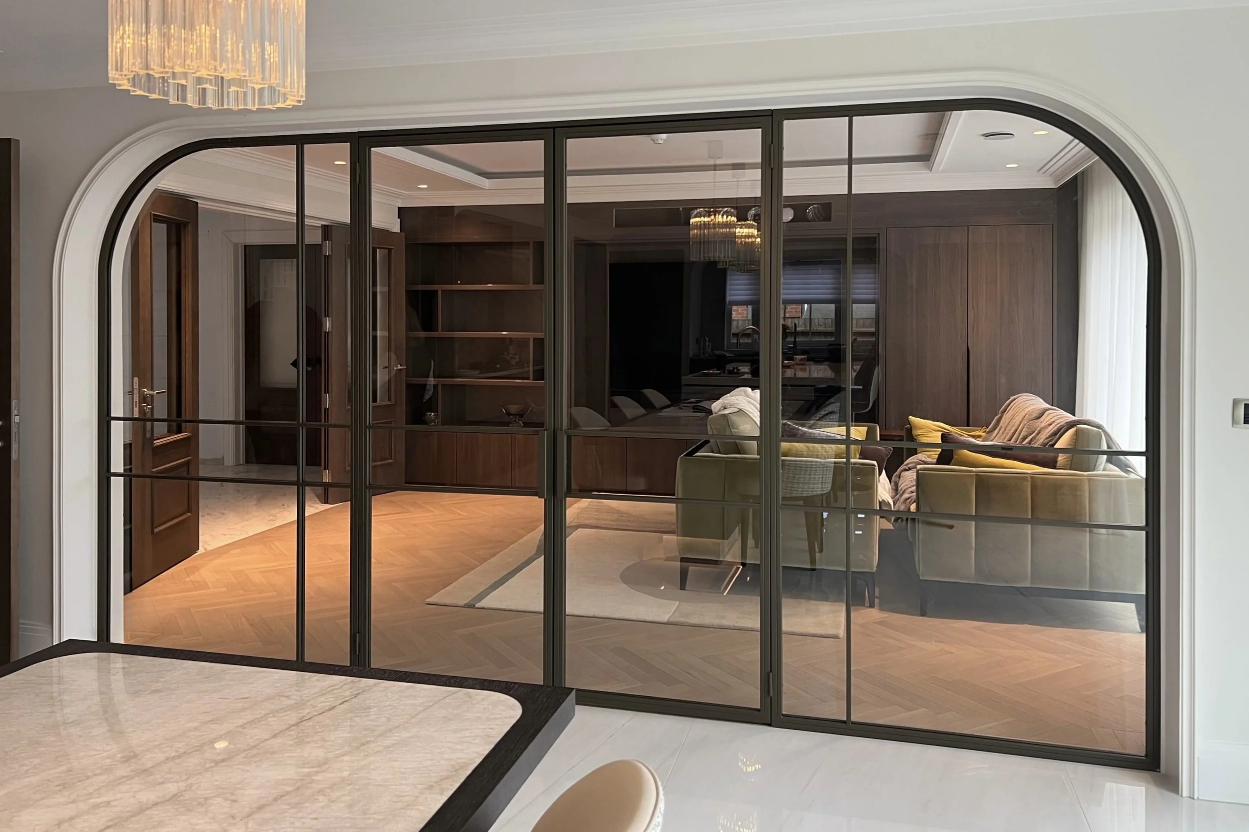 Open-plan layouts benefit from steel dividers that zone spaces without blocking brightness. A glazed partition between kitchen and dining allows both rooms to feel distinct yet flooded with daylight.