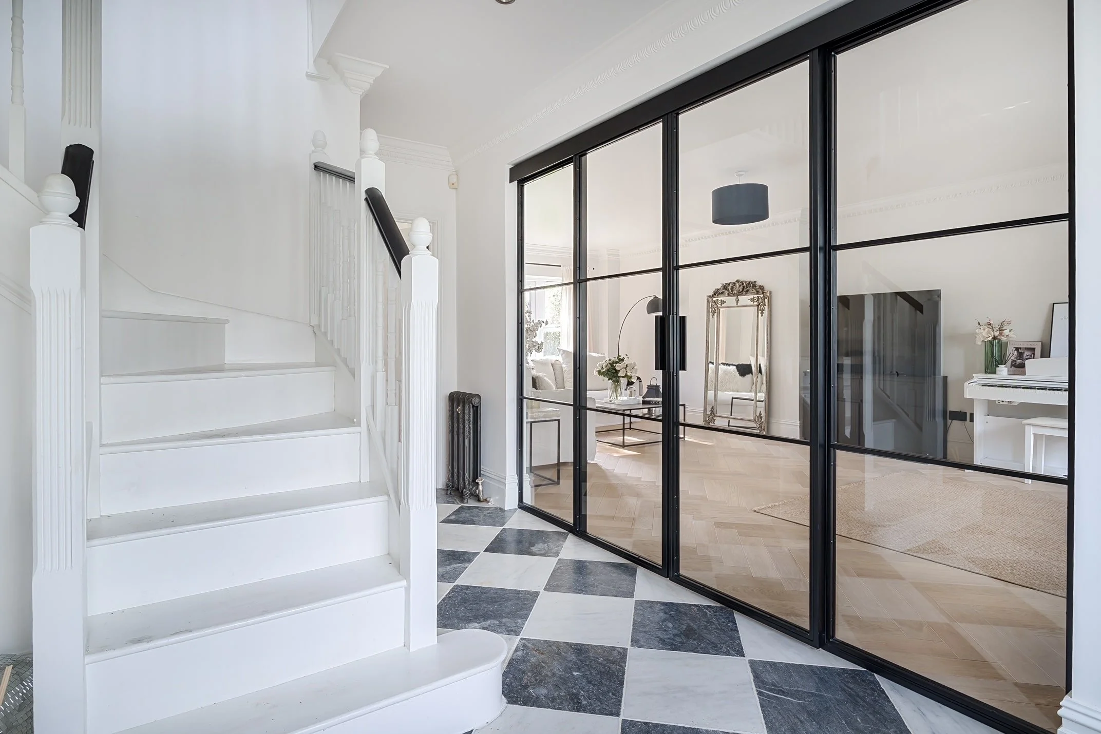 In a full renovation, a pair of double steel doors were installed at the end of a grand hallway. The slim bronze frames framed views of the garden, filling the entrance space with daylight and setting an uplifting tone for the home.