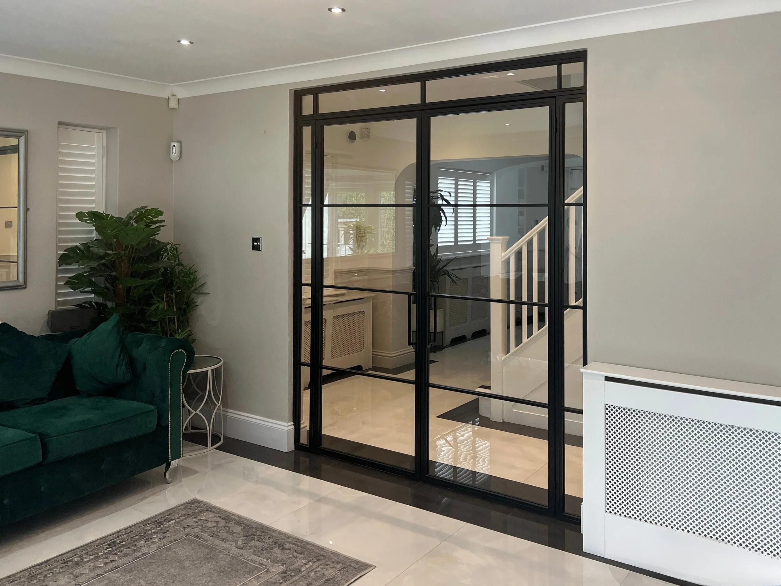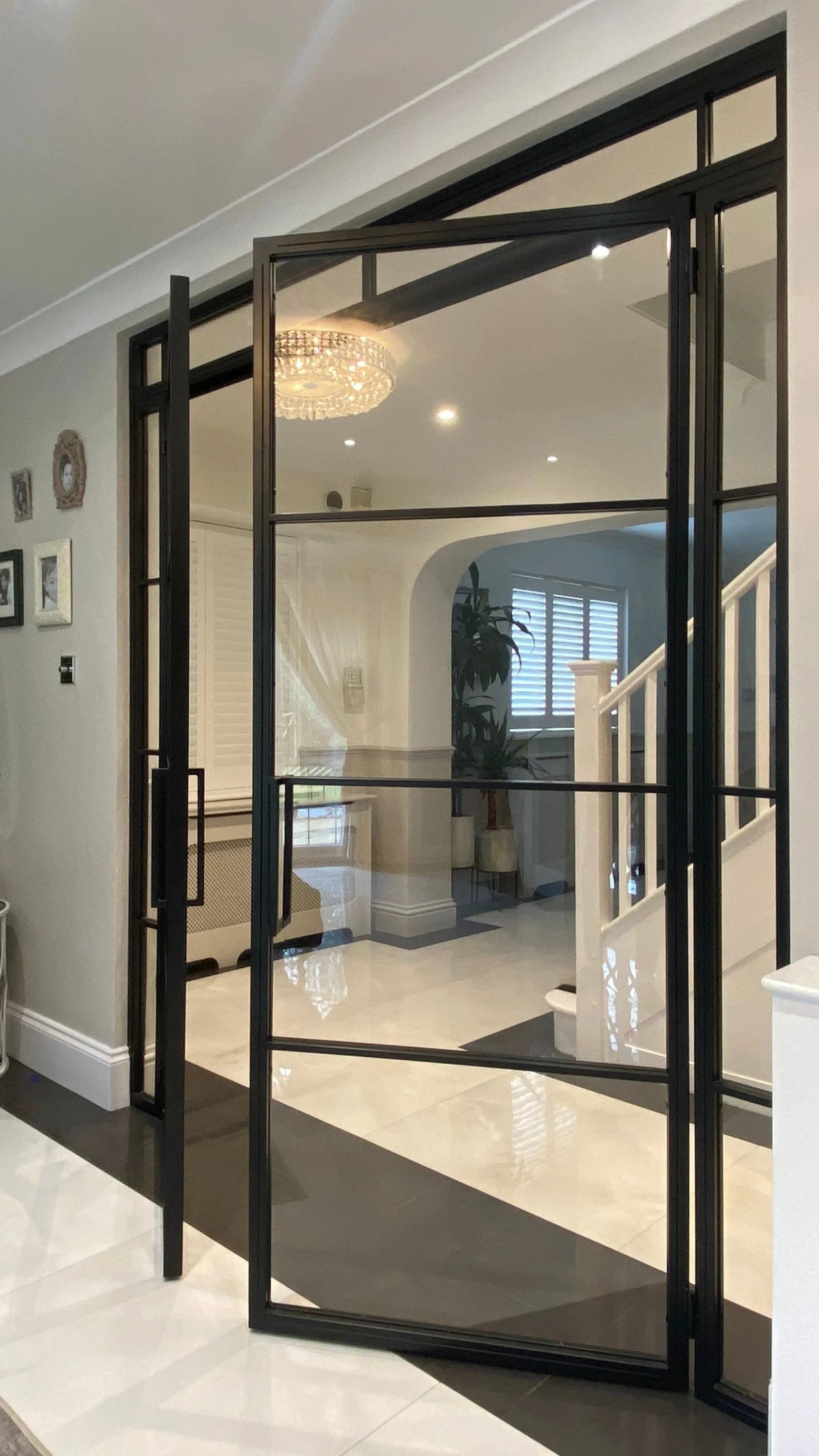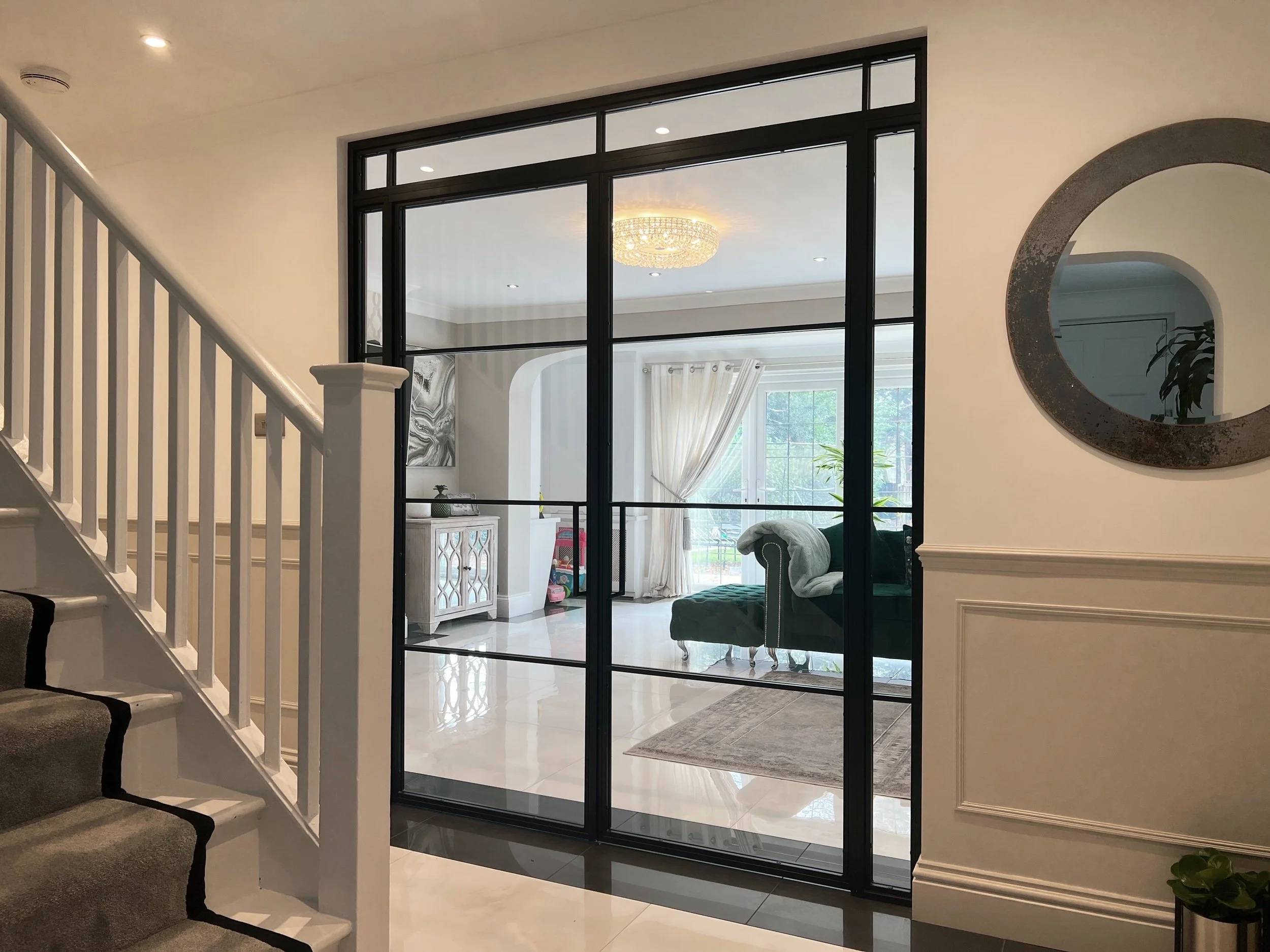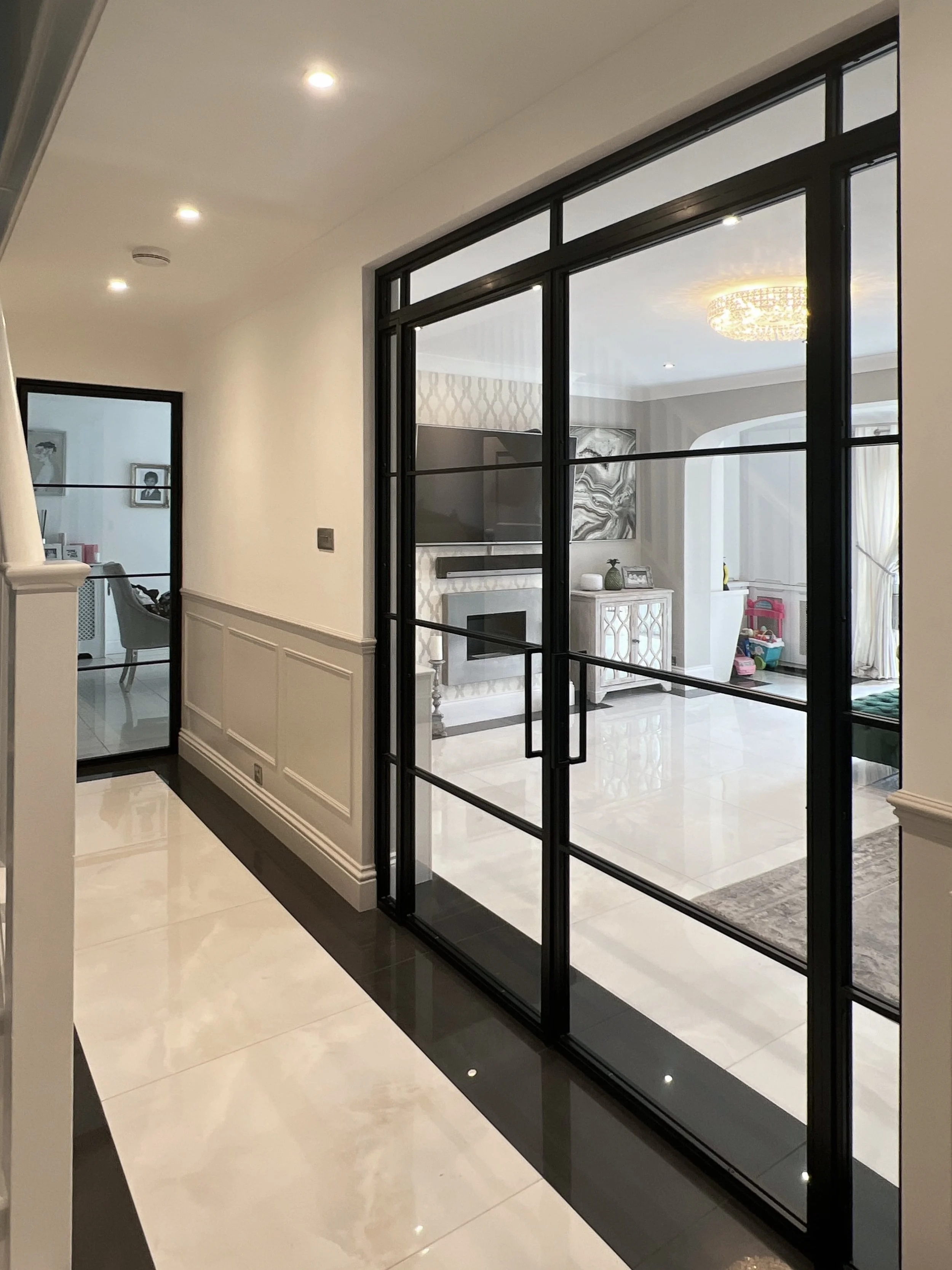 Looking to modernise their home, our client discovered us online while researching internal steel doors. They were drawn to the refined aesthetic of our InoCross20 system and selected a double door set with fixed side screens and an over panel, complemented by a matching single door to separate the hallway from the open-plan kitchen and dining area. To ensure consistency across all elements, we suggested making both he single and double door sets the same height—so that the horizontal Cross Bars aligned perfectly.
