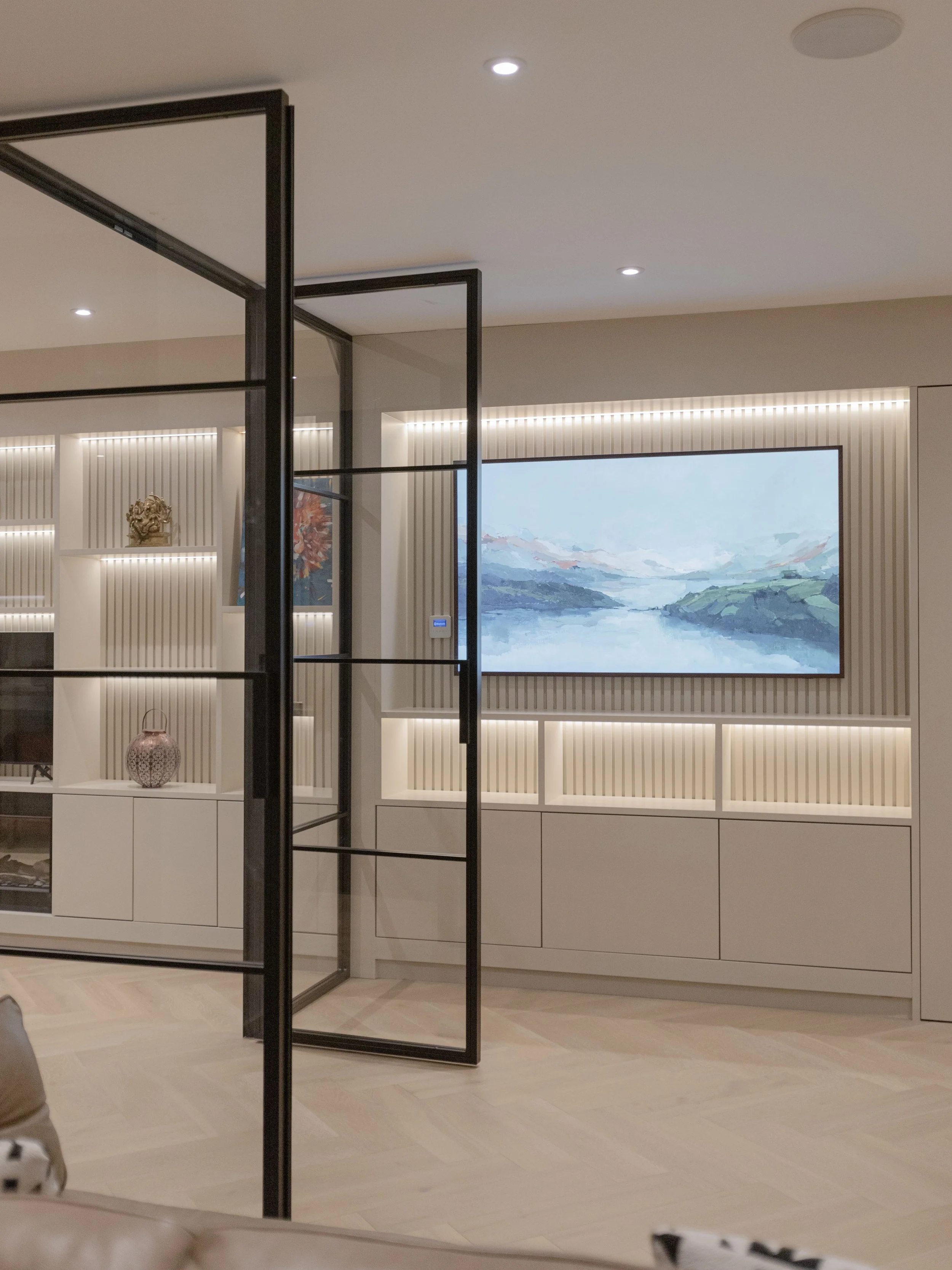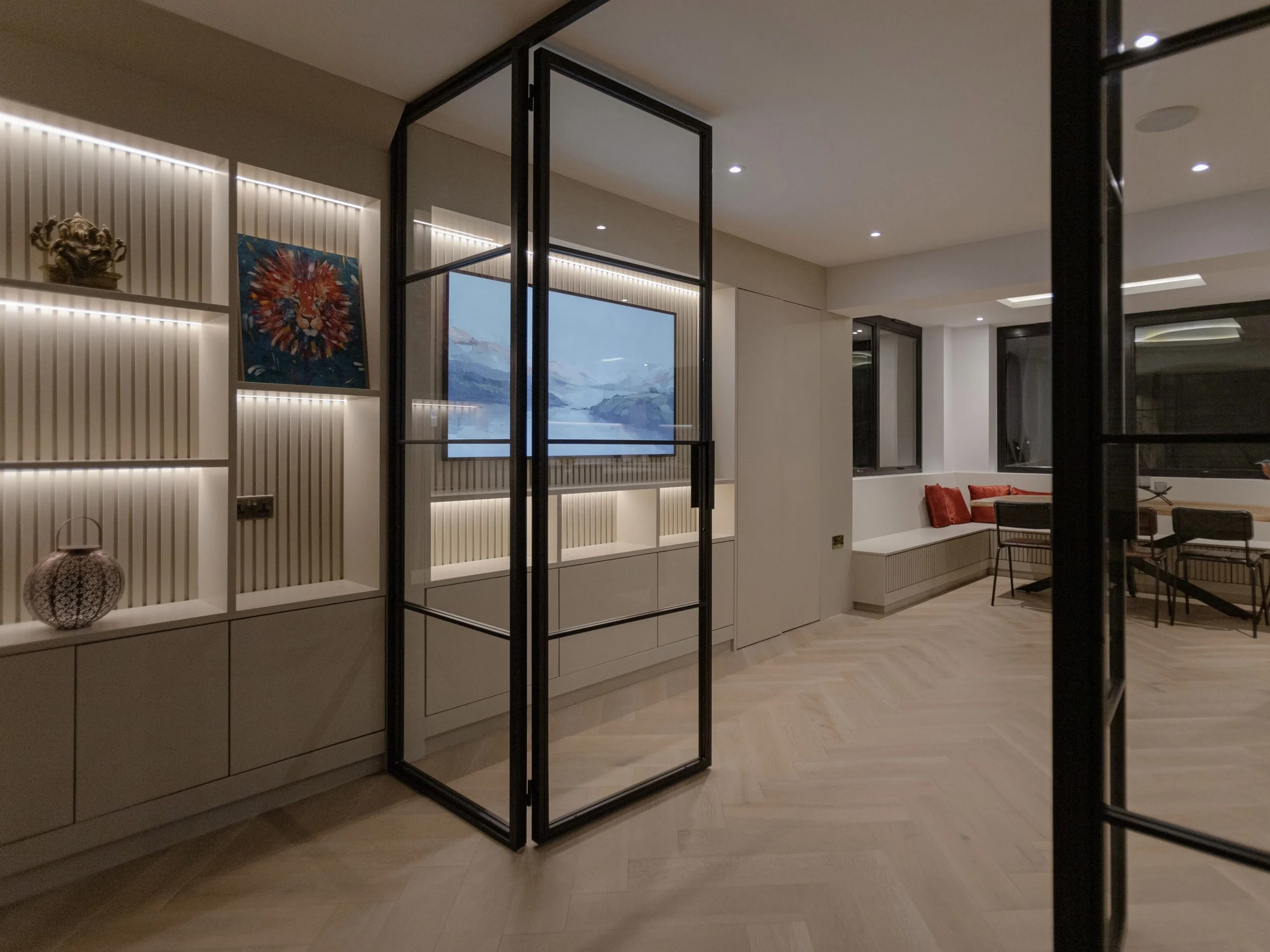 The double door set was strategically positioned within a small nib of bespoke joinery, a considered detail that allowed the doors to fold neatly back against the side screen. This clever placement ensures that when the doors are open, they do not interrupt the flow between spaces or obstruct the view of the television from either room—a subtle yet effective integration of form and function.
