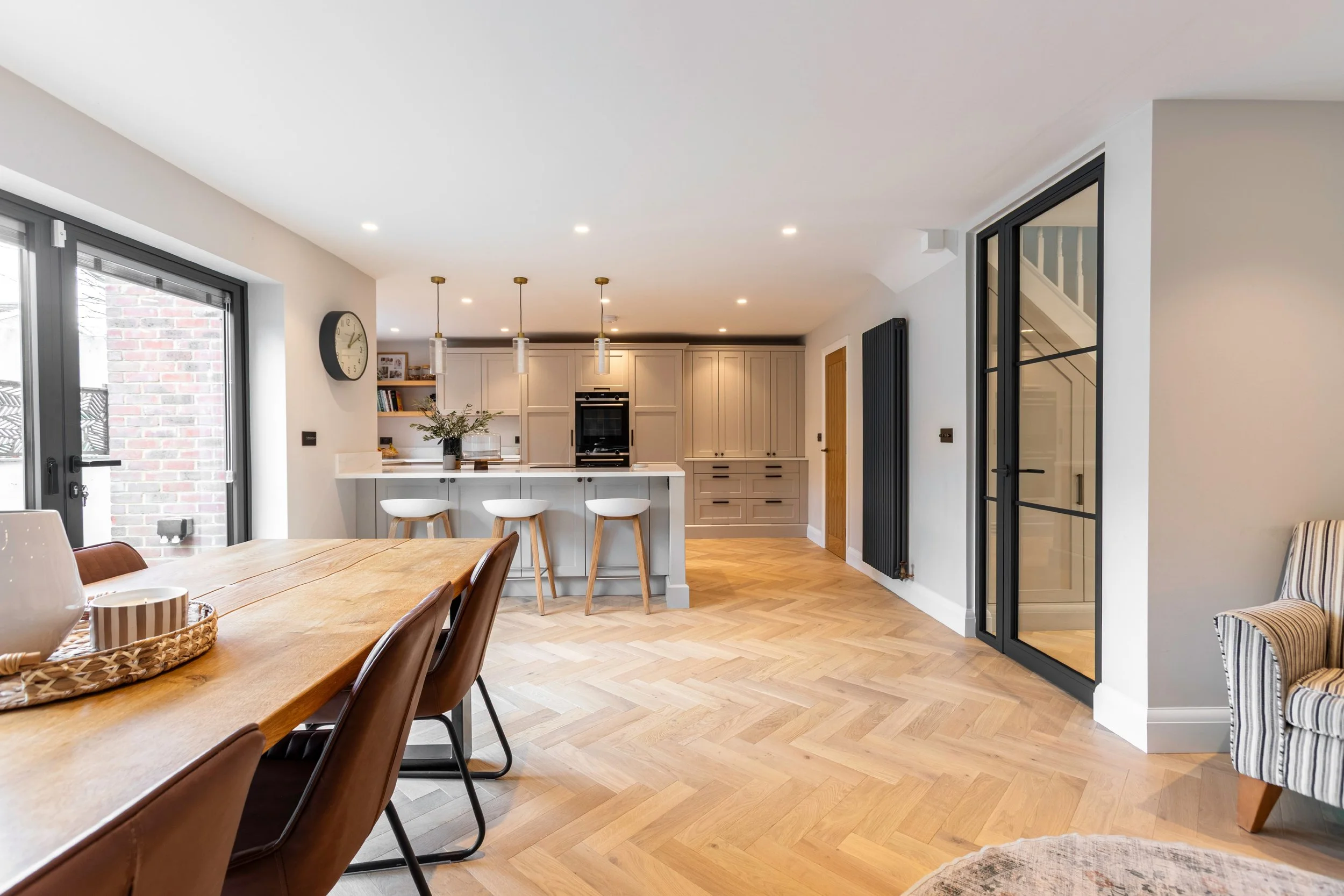 This project arose from the need to introduce a compliant fire-rated separation between the hallway and the main living space, following guidance from building control. As is often the case in open-plan renovations, the challenge lay in meeting fire regulations without compromising the openness, light and cohesion of the interior.