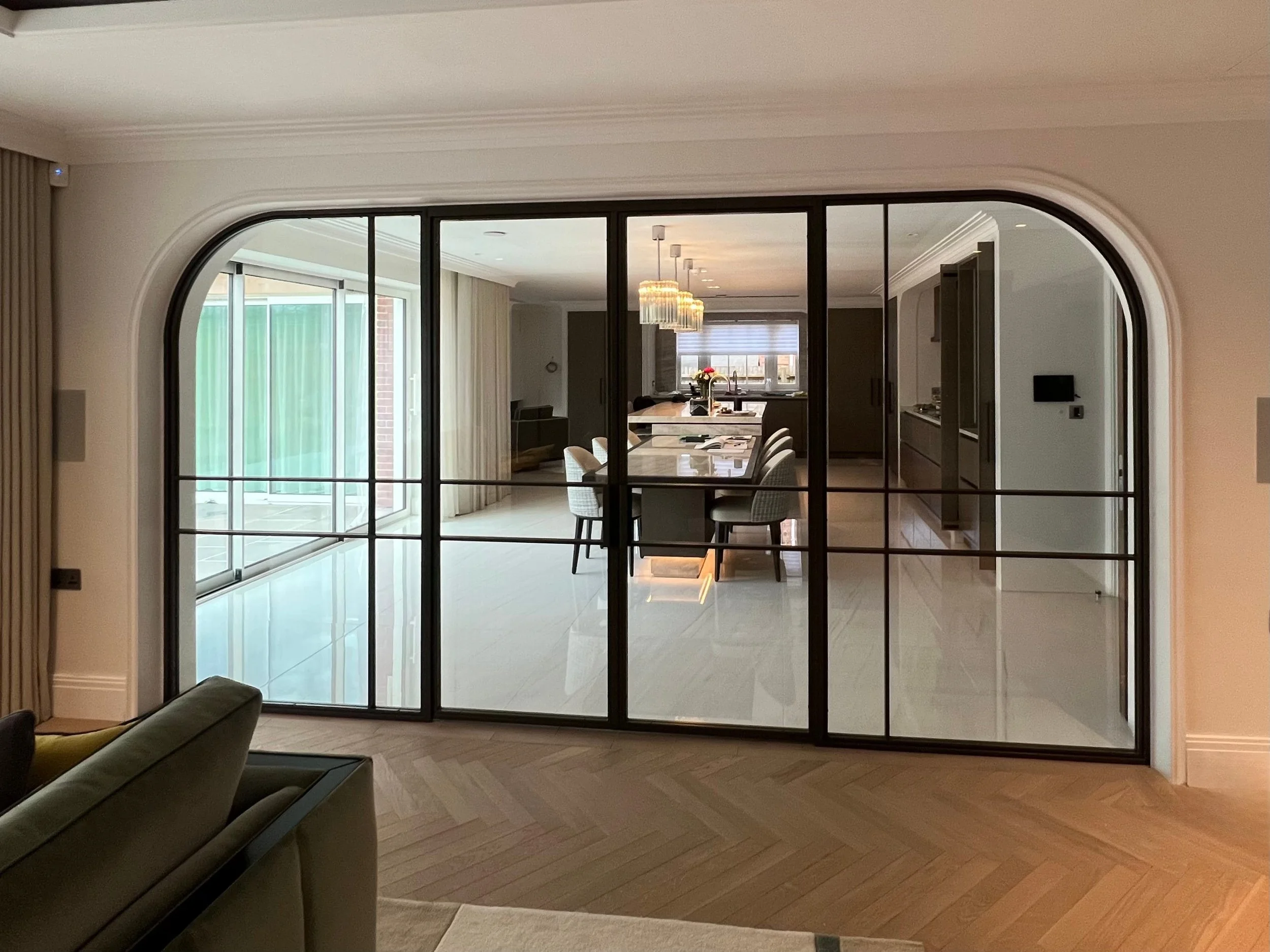 In the heart of Gerrards Cross, Buckinghamshire, we completed the installation of a striking arched double-hinged door set, finished in a warm, understated bronze. Designed to enhance the flow between a light-filled kitchen and a cosy snug, this internal feature adds architectural interest while maintaining the effortless openness of the space.