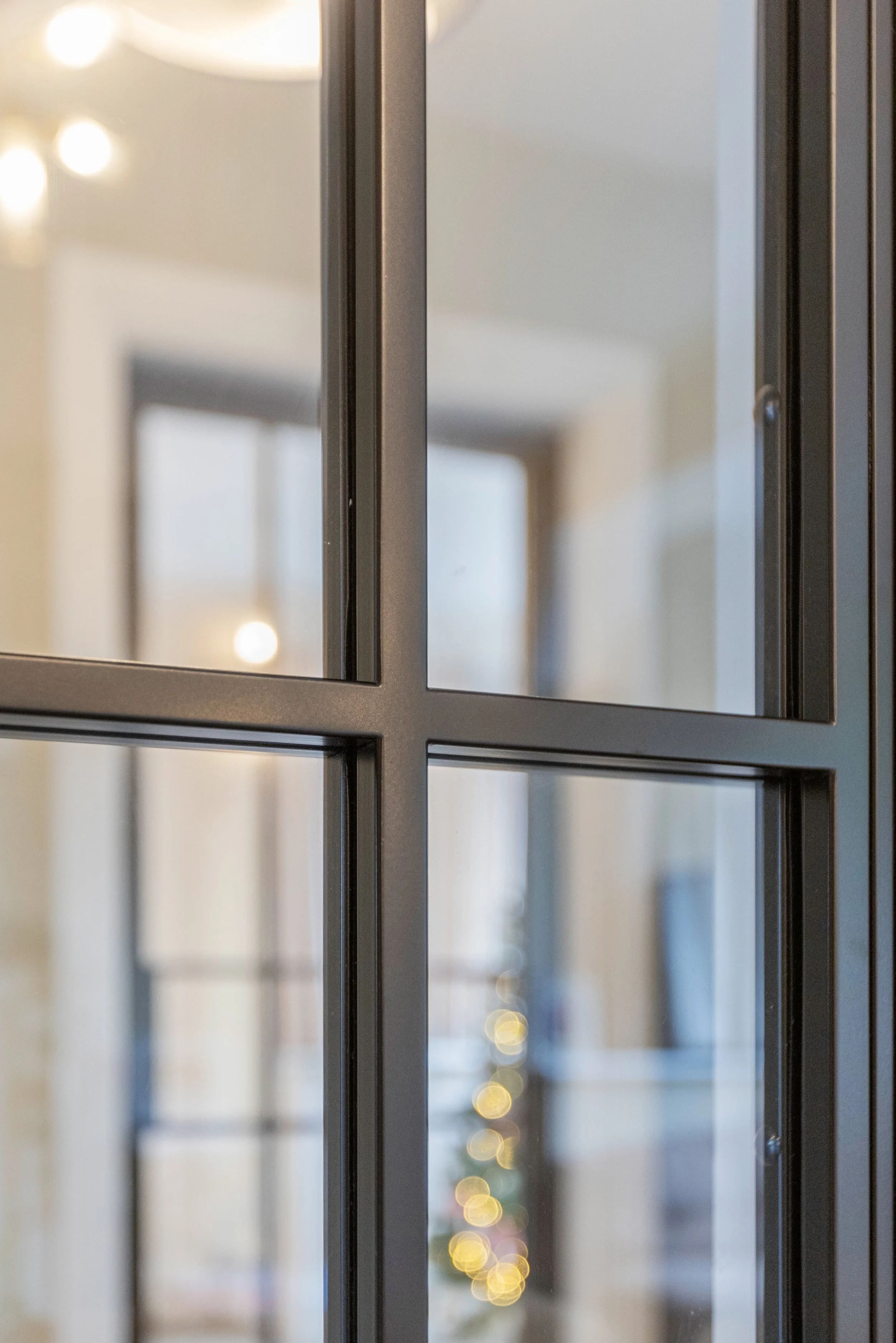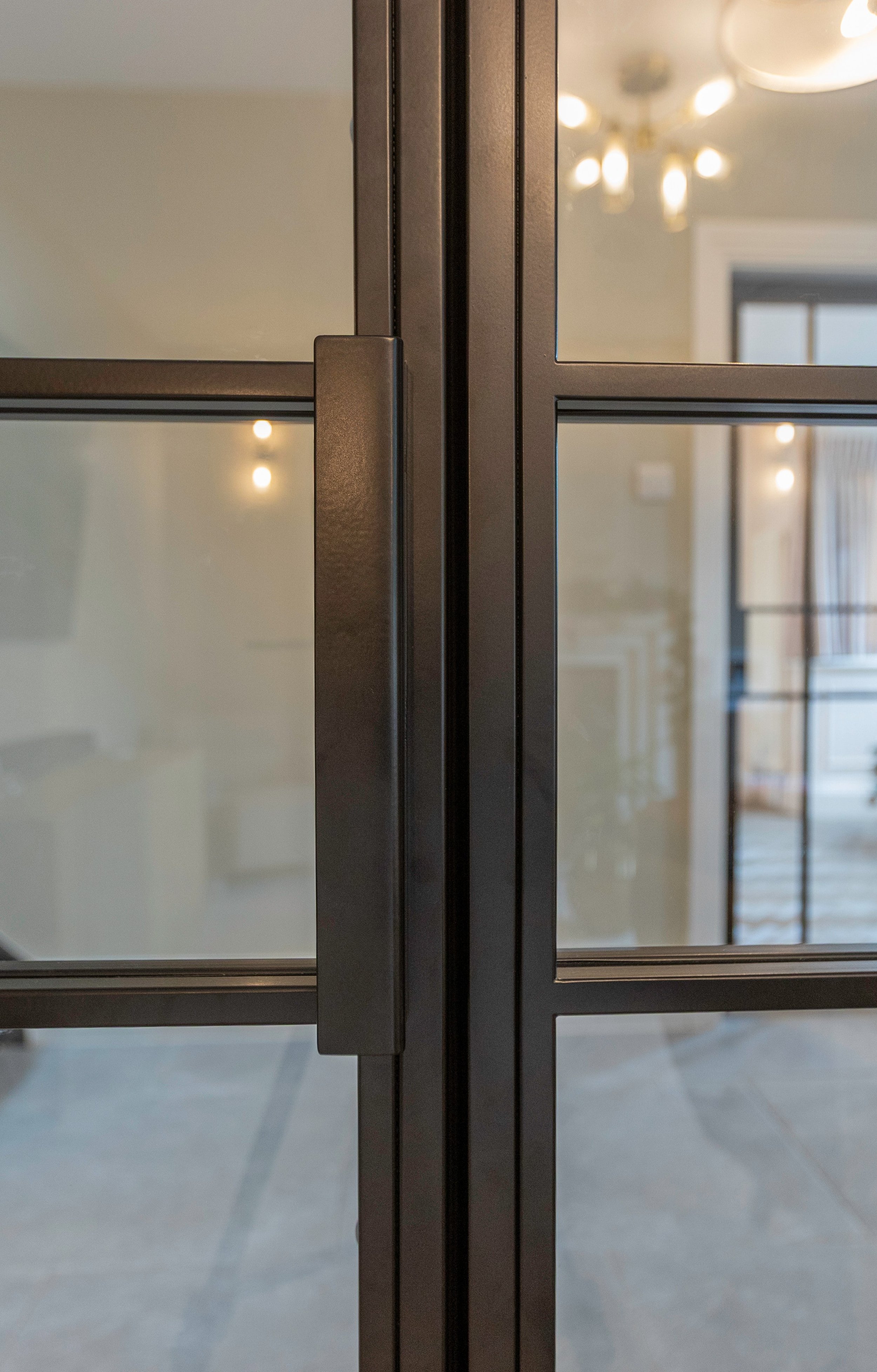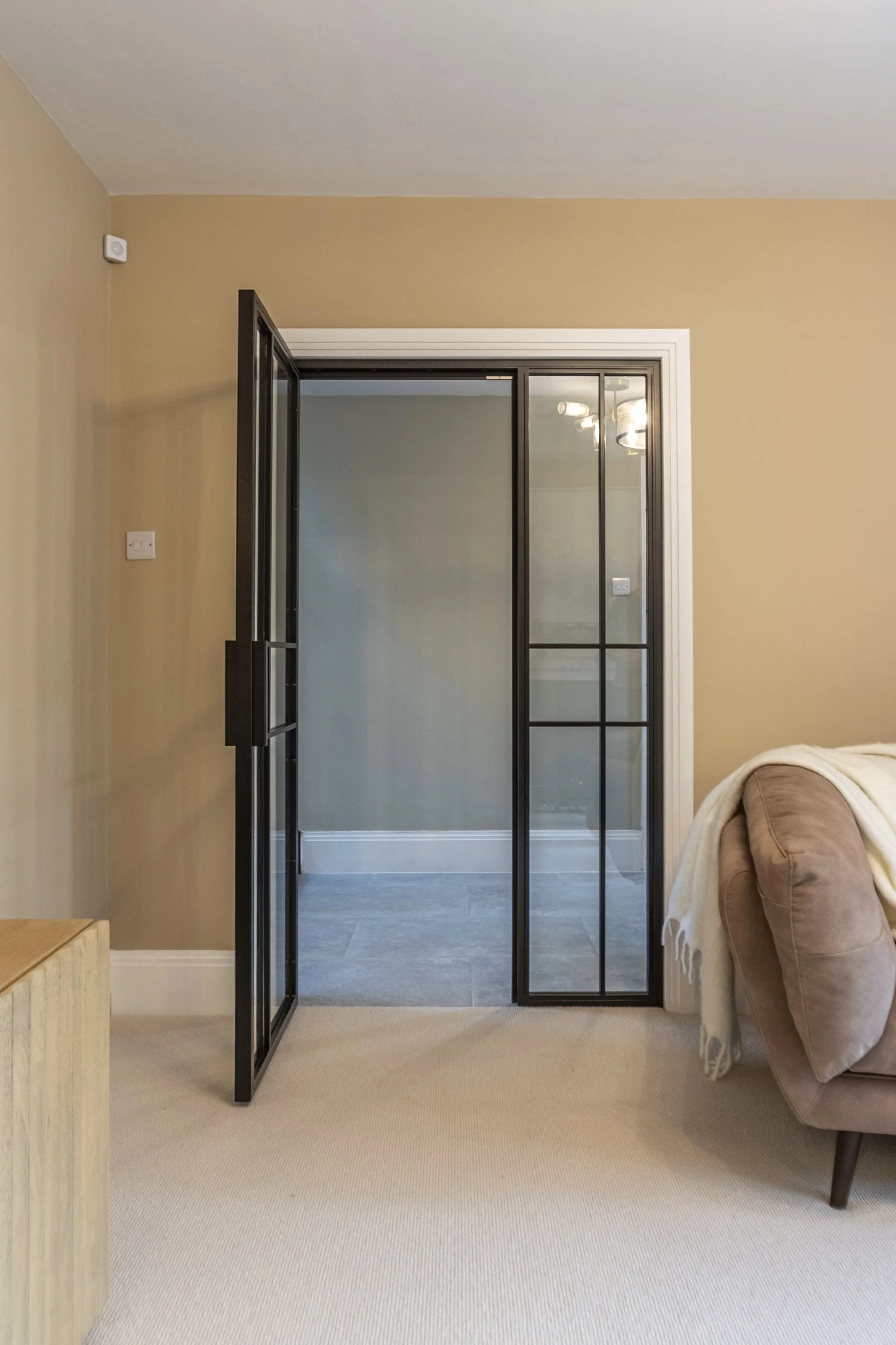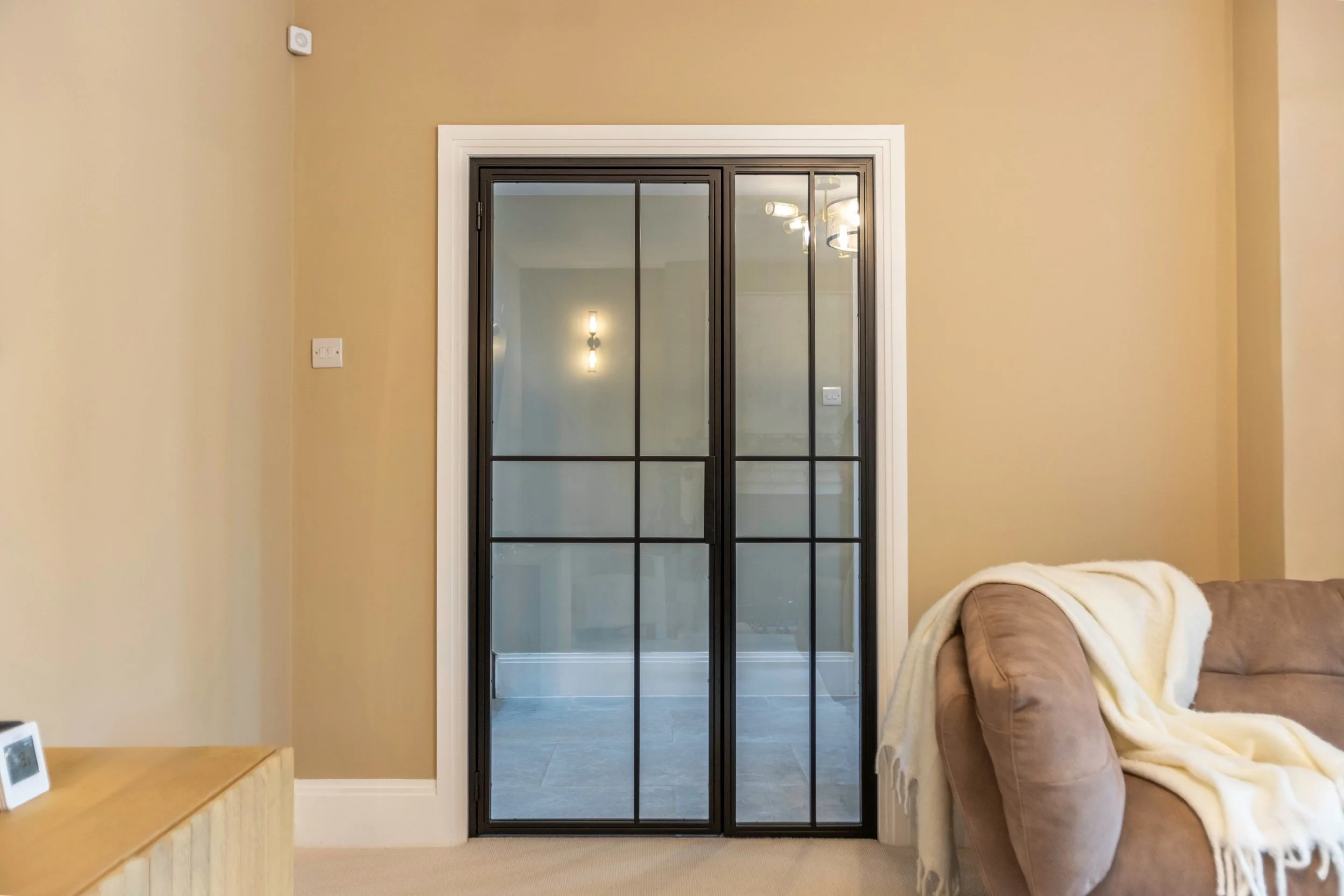 To ensure the new steel-framed doors integrated perfectly with the existing interiors, both were finished in RAL 9005 black, matching the home’s timber doors. The apertures also feature a thick white architrave, identical to the timber door frames, creating a beautifully coordinated contrast. This combination of black steel doors framed in crisp white demonstrates just how successfully steel glazing can complement traditional joinery and elevate a home’s architectural detailing.