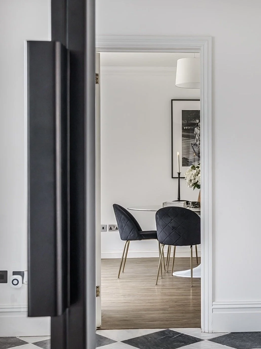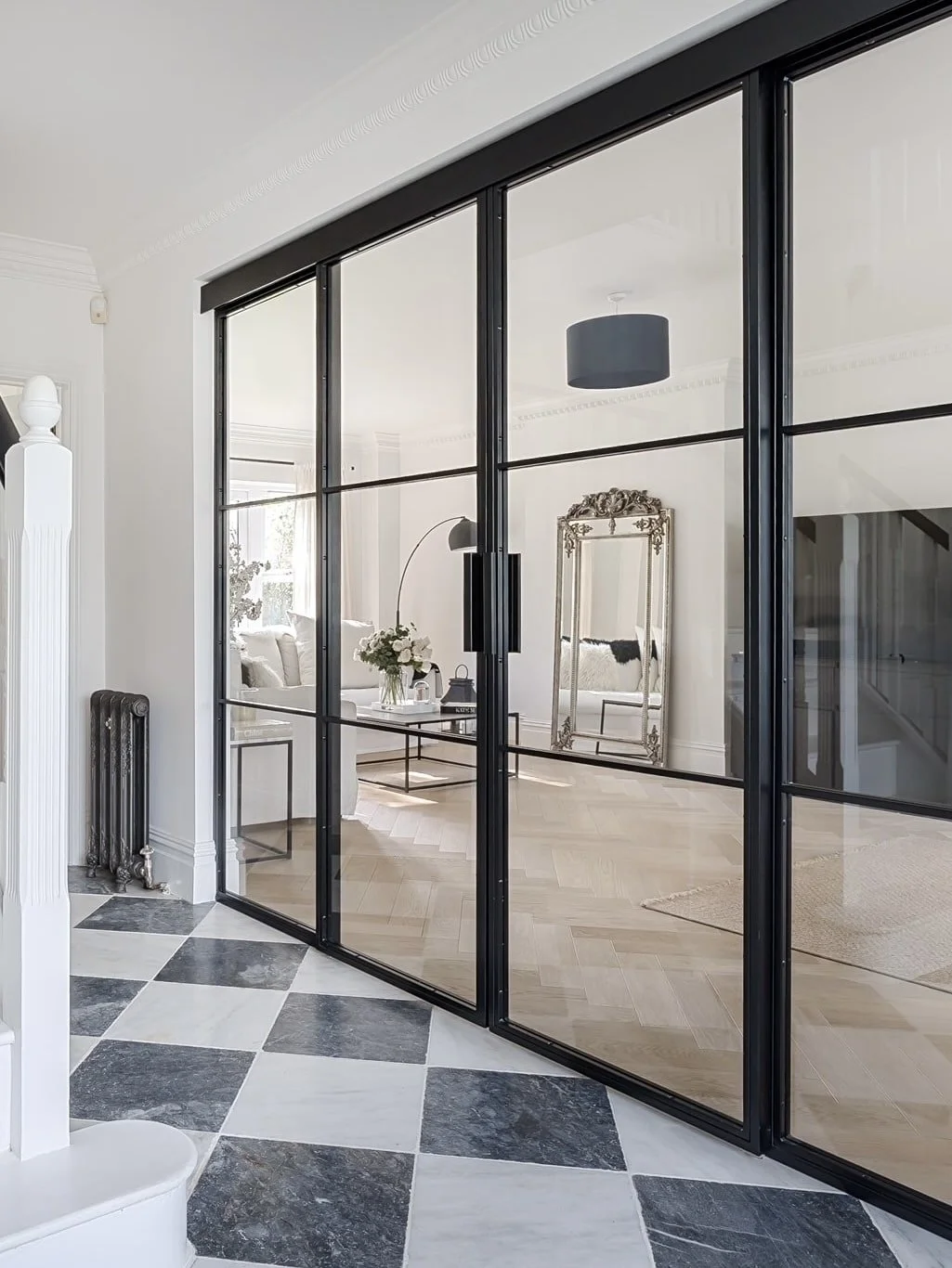 We strategically positioned the door set to span the transition between tiled flooring in the entrance hallway and wooden flooring in the living room. This placement creates a natural visual divide between the two spaces, while allowing the overall layout to remain bright, open, and connected.